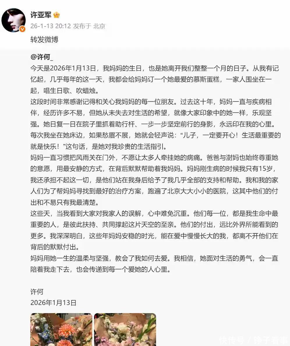 何晴离开整整一个月了,62岁生日那天,本该是家人围坐、点蜡烛唱生日歌的日子,如今只剩追忆。她儿子许何在社交平台写下长文,字里行间满是不舍,也悄悄回应了外界那些纷纷扰扰的猜测。